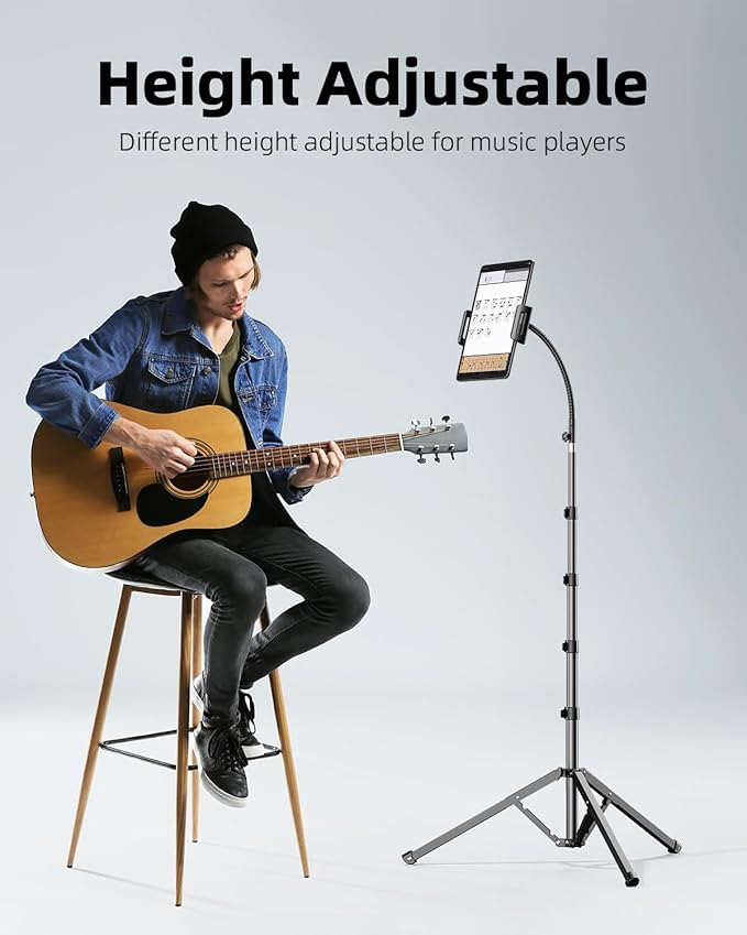 - Adjustable Tablet&Phone Tripod: Tripod floor stand can extend to maximum height of 82 inches and can be lowered to minimum of 13.5 inches. The 15”gooseneck can be bent freely to achieve the desired angle and height,offering you perfect vantage point for capturing or the most comfy position as a holder.It accommodates tablet cases well.