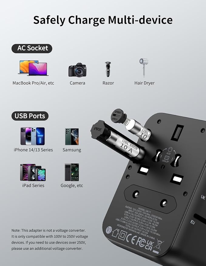 - Portable and Safe - MOMAX advanced GaN technology compresses this travel plug adapter to a surprisingly compact size (2.86" x 2.15" x 2.1") and lightweight (4.8 oz), In addition to GaN cooling and fireproof PC material, this international travel adapter also has 10A overload dual fuse, safety shutters and plug lock system, supporting short circuit, over-voltage, over-current protection, and with RoHS, CE, and FCC certifications which can effectively avoid the danger during charging, provide extra peace of your mind.