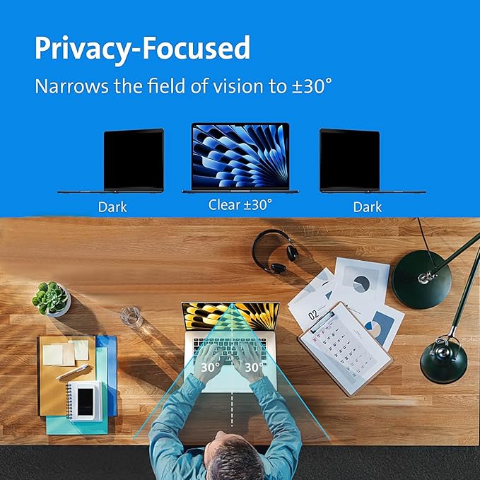 - 2.【Superior Privacy Protection】: MacBook Air 15 inch Privacy Screen filter limits viewing angle to +/- 30 degrees, data is visible only to persons directly in front of the monitor while prying eyes beside you see only nothing. MacBook Air M4 Privacy Screen, to protect your sensitive information, your passwords, personal content, etc., Prevent information from being leaked. It also protects your eyes from harmful glare,UV,and blue light,keeping prying eyes away from password and document info.