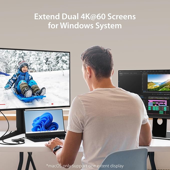 - Versatile Dual Display Support: Connect your laptop to two 4K60Hz monitors or an 8K UHD / 4K 144Hz external monitor, UHDTV, projector, and more. Enjoy a dual-screen setup that enhances productivity and multitasking.