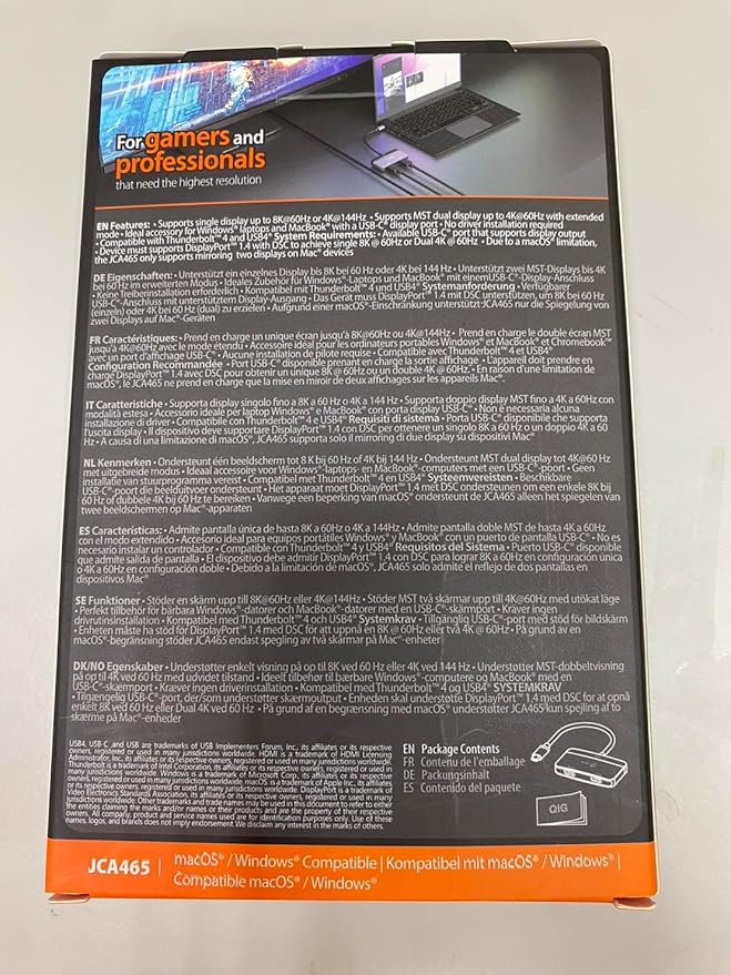 - Notes: For optimal display performance, we recommend using JCA465 with Windows 11/10 computers. Due to Mac and macOS system limitations, Macs with M1 or M2 CPUs only support one external display, and the MacBook series supports a maximum of 4K at 60Hz with HDMI output. Since macOS does not support MST (Multi-Stream Transport), displays connected to the JCA465 will only mirror each other.