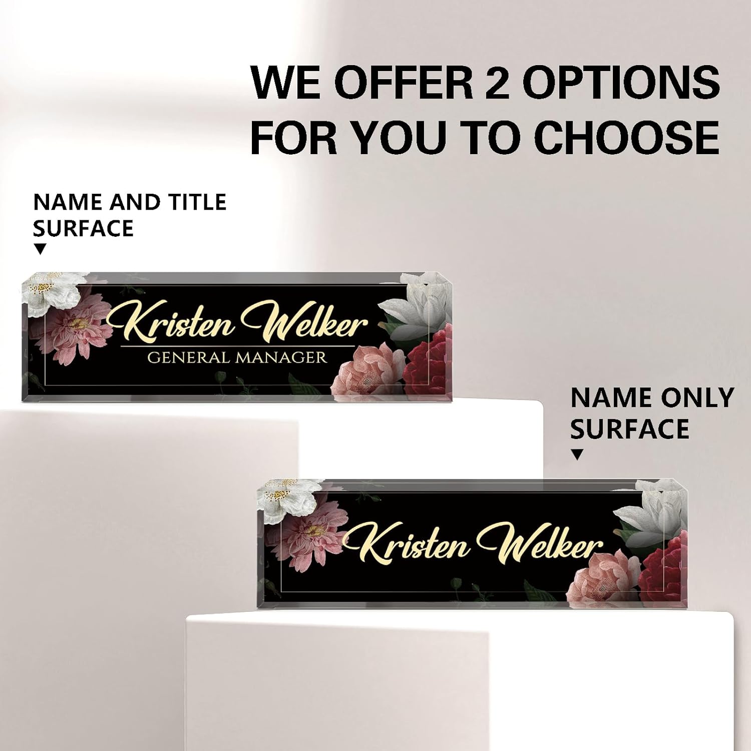 Name Plate for Desk, Desk Name Plate Personalized, Office Decor for Women Men, Acrylic Desktop Accessories, Office Appreciation Gifts for Boss Social Workers Nurse Teacher Employee (Black/Flowers)