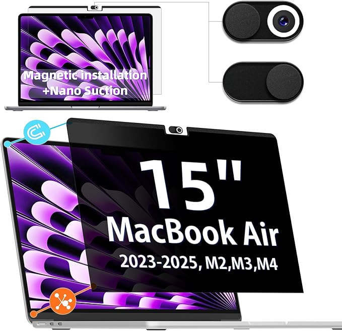 - 【Magnetic Installation + Nano suction】MacBook air privacy screen design with magnetic suction and nano suction, nano suction solves the problem of floating at the bottom, it can be installed in two seconds and easy to take off according to your needs. No worry about mess adhesives and air bubbles. The MacBook 15inch privacy filter reduce the thickness of magnet by 50% but double the strength which make the privacy film stick to the screen tightly. No gap when closing the MacBook Air 15.