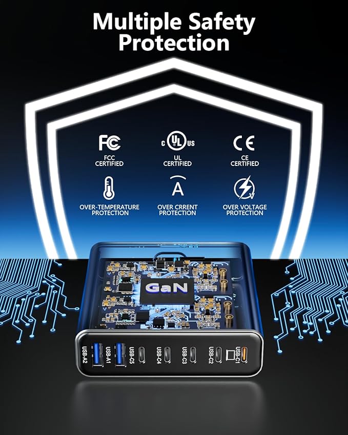 - 7 MultiProtect Safety Systems: Our 260w usb c charger block is equipped with enhanced surge protector: Temperature Protection, Over-Current, Over-voltage, Overcharge, Overload, Overheat and Short circuit. The certification authority of our usb-c charger is in line with safety certifications, ensuring 100% for you and your device's protection. So we are confident in providing lifetime service.