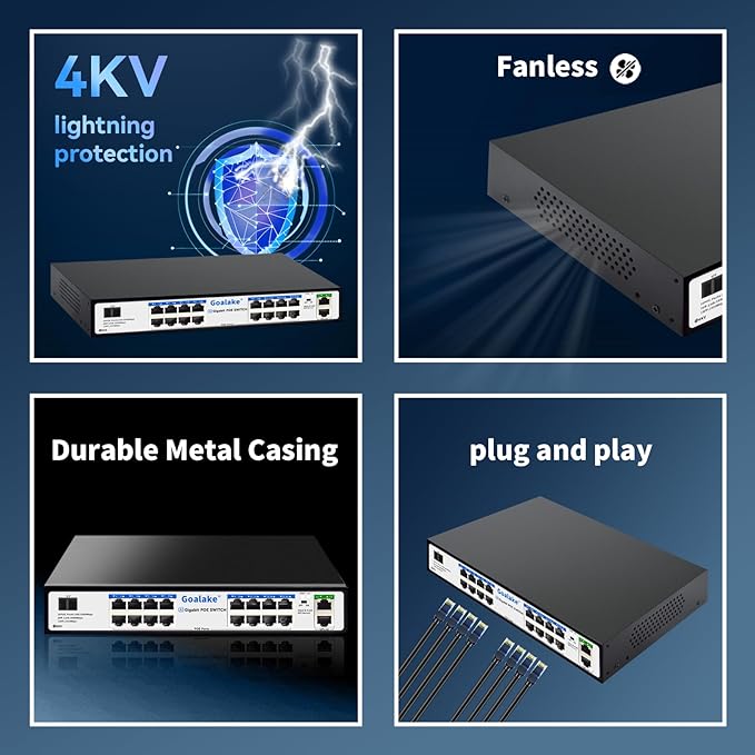 - Enhanced Protection: Our 16 port gigabit poe switch Includes network cable short-circuit protection, overcurrent protection, overvoltage protection, and 4KV lightning protection, safeguarding your devices and ensuring reliable network performance.