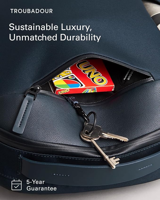 - TRAVEL-FRIENDLY FEATURES WITH 5-YEAR GUARANTEE: Includes a luggage sleeve for seamless transitions from street to airport, a lockable main compartment, valuables pocket with key leash, and AirTag pocket for added security. Backed by a 5-year guarantee, it's an ideal laptop backpack for both men and women seeking a premium carry solution.