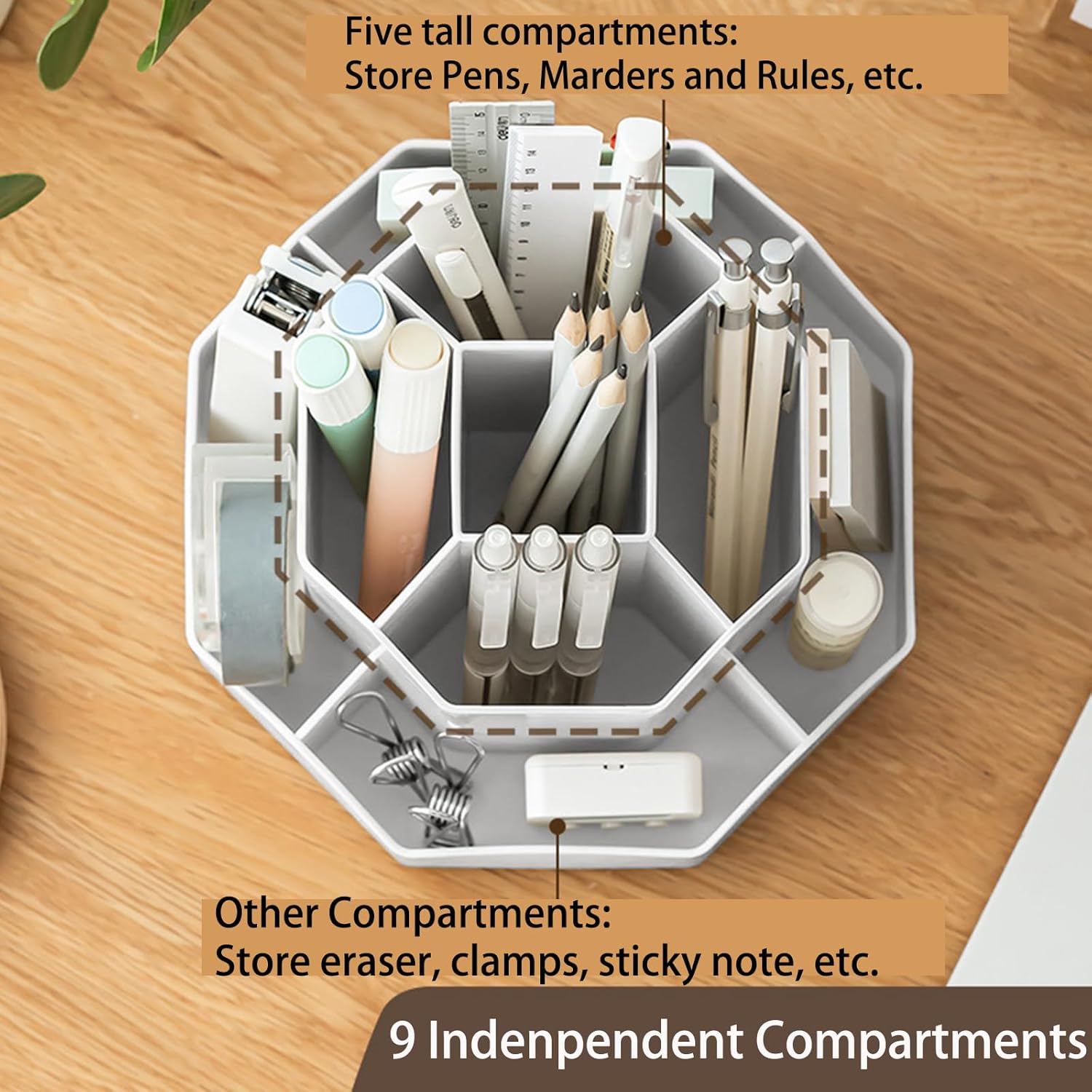 - 【9 Independent Compartments Design】This pencil organizer has 9 divided compartments with different spaces and heights to meet your needs, makes it easy to hold and sort pencils, pens, rulers, scissors, pencil knife, etc. Save your time searching for different pens.