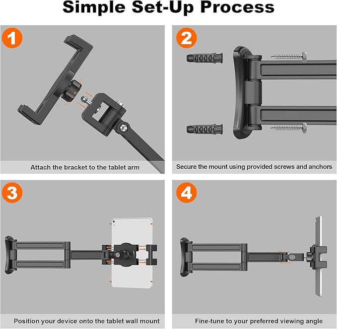 - HASSLE-FREE INSTALLATION: Our tablet wall mount holder simplifies setup. Including all necessary mounting hardware, this wall mount ensures a smooth installation process. Crafted for user-friendliness in diverse settings, from homes to professional spaces.