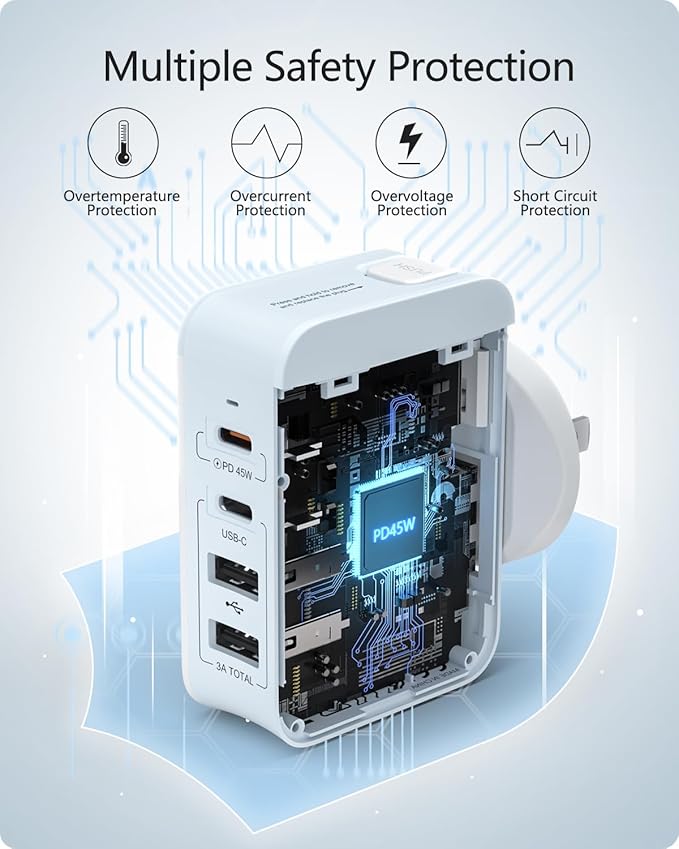 - 【Certified Safe】 The certifications of UL/CE/UKCA/FCC make this travel plug a safety system, which can protect your devices against excessive current, overheating, and overcharging.