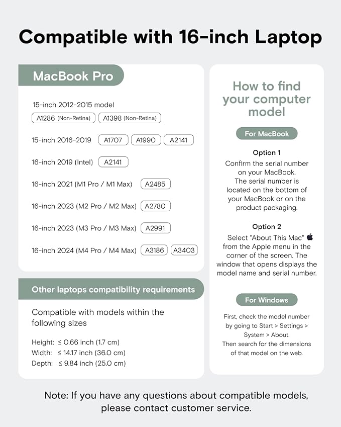 - Compatibility: Designed for 15-16 inch laptops. Laptop sleeve dimensions: 15.8 x 10.5 inch, Maximum compatible size: 14 x 9.8 x 0.7 inch. Laptop sleeve Precisely fits MacBook Air 15-in.(M2/M3/M4, 2023-2025), MacBook Pro 16-in.(M4 Pro/M4 Max, 2025), MacBook Pro 16-in.(M3 Pro/M3 Max, 2023), MacBook Pro 16-in.(M2 Pro/M2 Max, 2023), MacBook Pro 16-in.(M1 Pro/M1 Max, 2021), MacBook Pro 16-in.(intel, 2019), MacBook Pro 15-in (2016-2018), MacBook Pro 15-in (2012-2015)