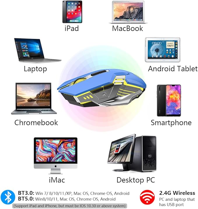 Blue Wireless Mice Gaming Mouse Bluetooth, Silent Multi Device Mouse, 2400 DPI, RGB Backlit, 800mAh Rechargeable Cordless Computer Mouse for Laptop PC Mac Macbook Air/Pro iPad Chromebook Office Game