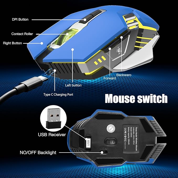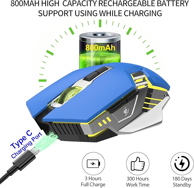 - ✨【800mAh High-Capacity Rechargeable Battery】- This glowing gaming mouse Built-in 800mAh long-lasting rechargeable battery, super long battery life, and easy charging by included USB cable, and can be used while charging. Three level automatic sleep modes, standby time up to 180 days.
