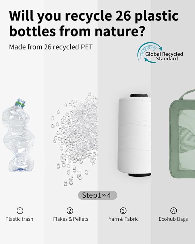 - 【SUSTAINABLE AND GUARANTEE】: ECOHUB travel packing cubes are made from at least 50% recycled materials, with fabric and lining crafted from 26 recycled PET plastic bottles. The lightweight fabric combined with YKK zippers and reinforced ripstop stitching, ensure durability for any adventure. If you have any concerns, reach out through your order. (Patent Pending)
