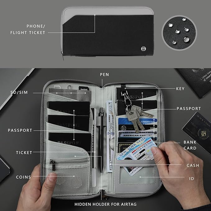 - Effortless Travel Organization Streamline your airport experience with this travel passport wallet, designed to consolidate all your family’s travel documents in one secure and easy-to-access place. No more fumbling through bags; keep your passports, boarding passes, and essentials at your fingertips.