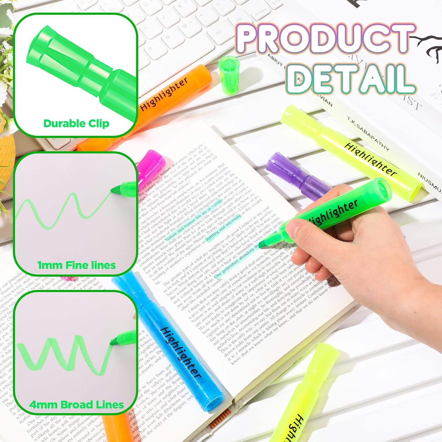 - Fluorescent Color Ink: these chisel tip highlighters have a fluorescent purple, green, orange, blue, pink, yellow color; You can also use these highlighters to complement different occasions and have a good time, for example, you can use the bright color highlighter to accent important information