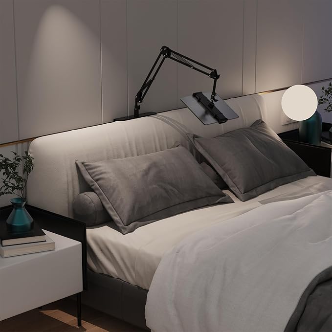 - 【Flexible Angle and height adjustment】: The powerful and flexible robotic arm can be easily adjusted to any position and bend in any direction. The universal knuckle ball on the back of the iPad clip easily tilts left and right and can be rotated 360 degrees for optimal use of the electronic device.
