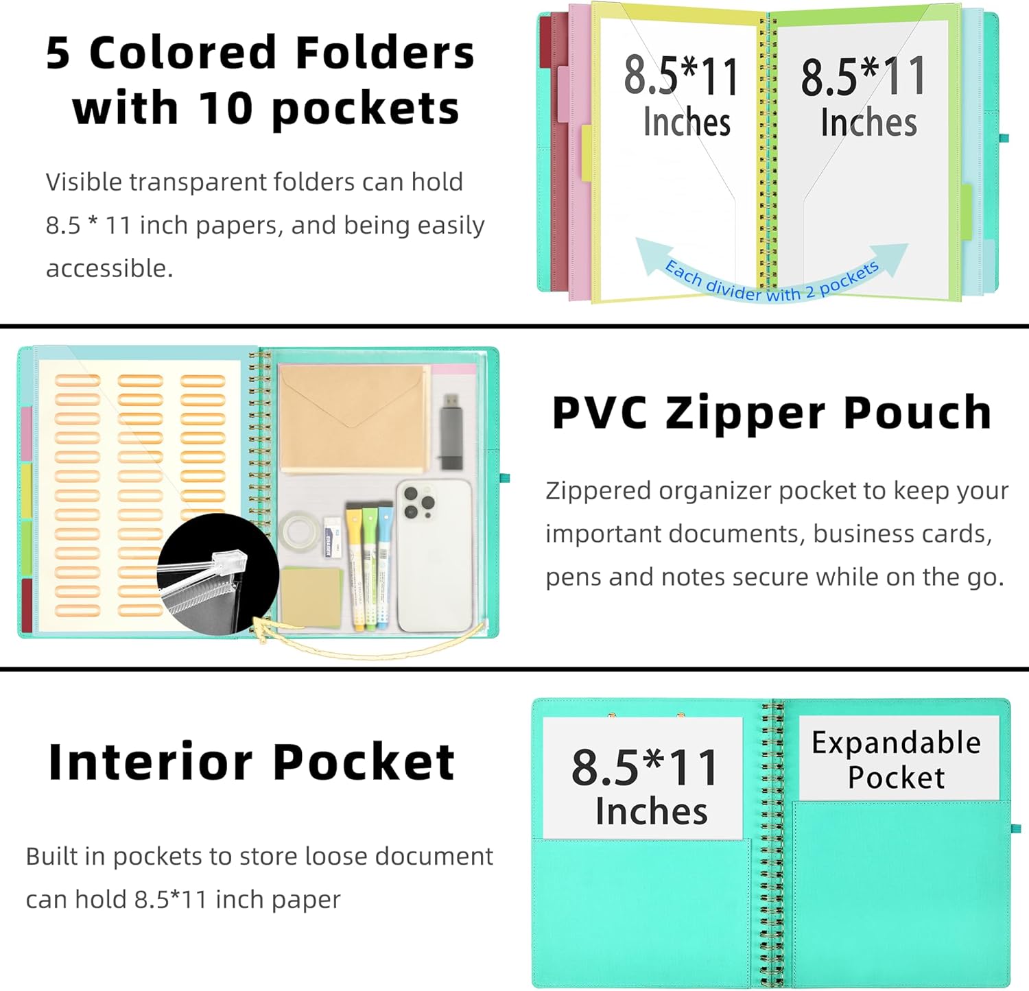 - 【Secure Storage】The portfolio organizer has a clear pouch with a zipper that provides a secure place to store documents, notes, or other items when you're on the go. The clipboard comes with 5 plastic folders that have 10 pockets, fitting all standard US letter-size sheets (11" x 8.5"). It is a great way to keep your papers organized and easily accessible.