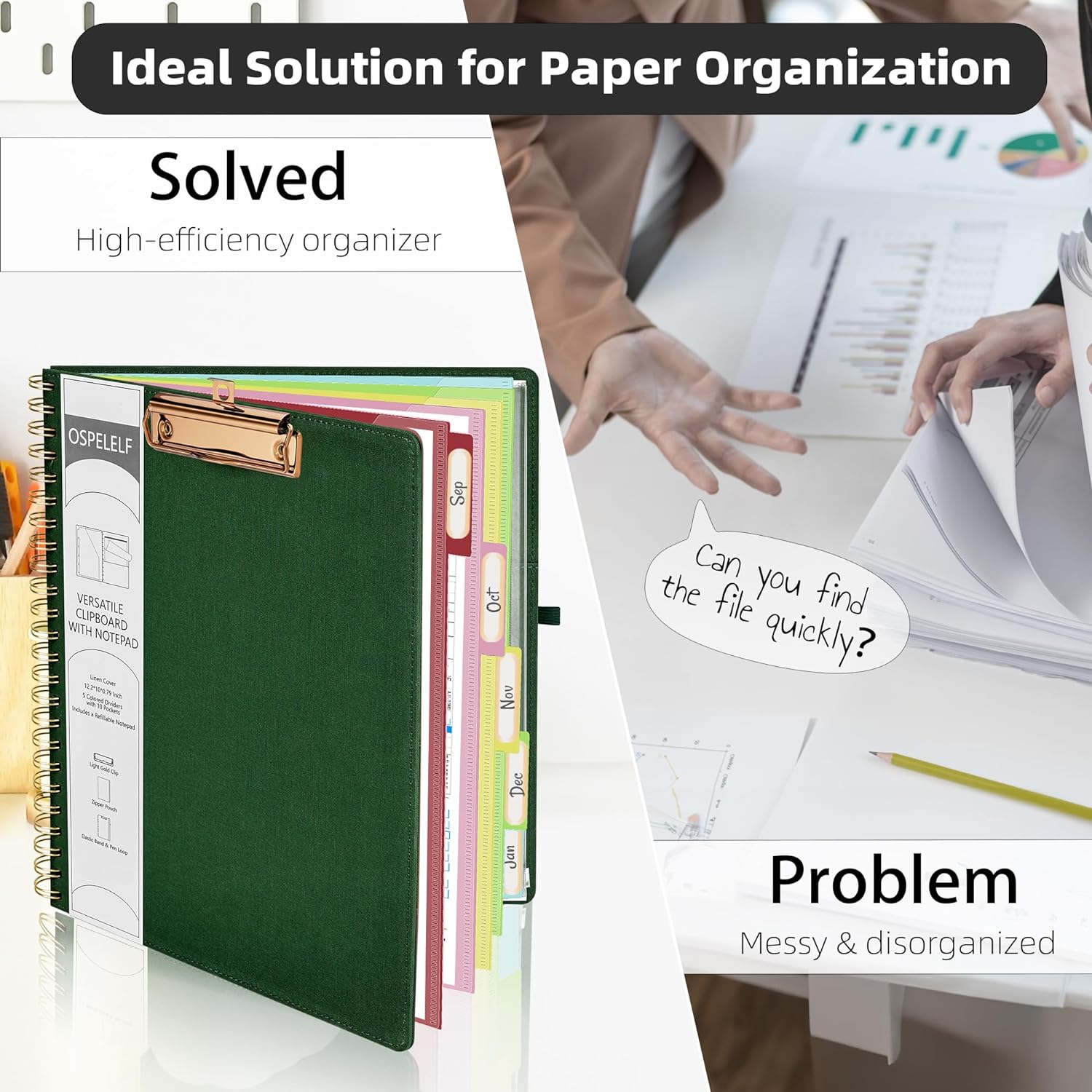 Ospelelf Foldable Spiral Clipboard Folio with Storage Zipper Pouch, 5 Plastic Folders with 10 Pockets,Refillable Lined Notepad (11" x 8.5"), Hardcover Project Organizer with 39 Stickers (Dark Green)