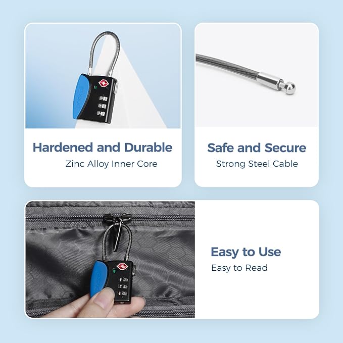 pack all TSA Approved Cable Luggage Locks, 3 Digit Combination Padlocks, Travel Lock for Suitcases & Bag, Alloy Body, Travel Accessories (4 Pack)(Navy)