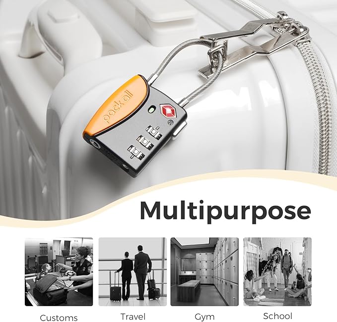 pack all TSA Approved Cable Luggage Locks, 3 Digit Combination Padlocks, Travel Lock for Suitcases & Bag, Alloy Body, Travel Accessories (4 Pack)(Orange)