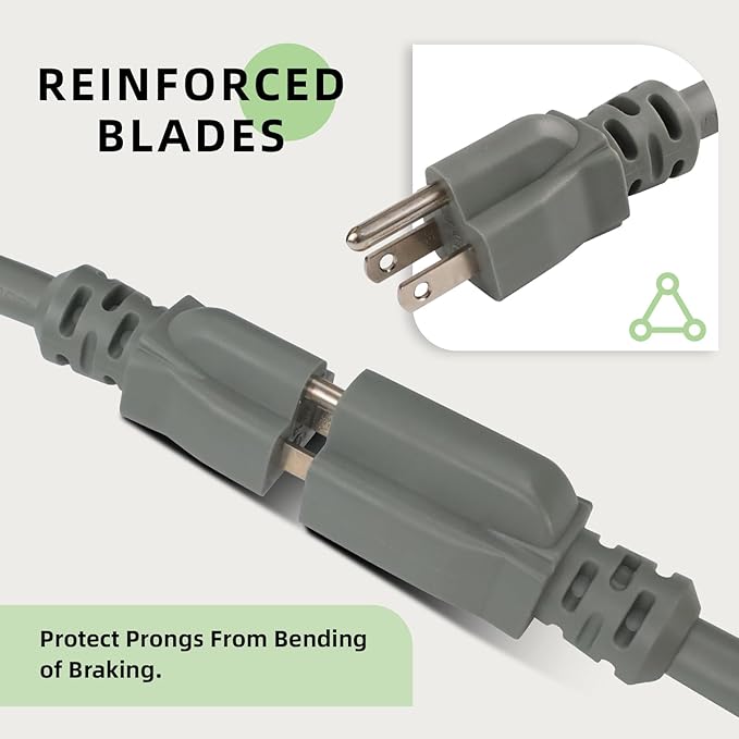 - Safe Cable - UL Listed, 3 prong grounded plug for added safety. Reinforced blades protect prongs from bending or breaking. Remain flexible and tangle-free under all weather conditions and wouldn’t become stiff or crack in cold weather.