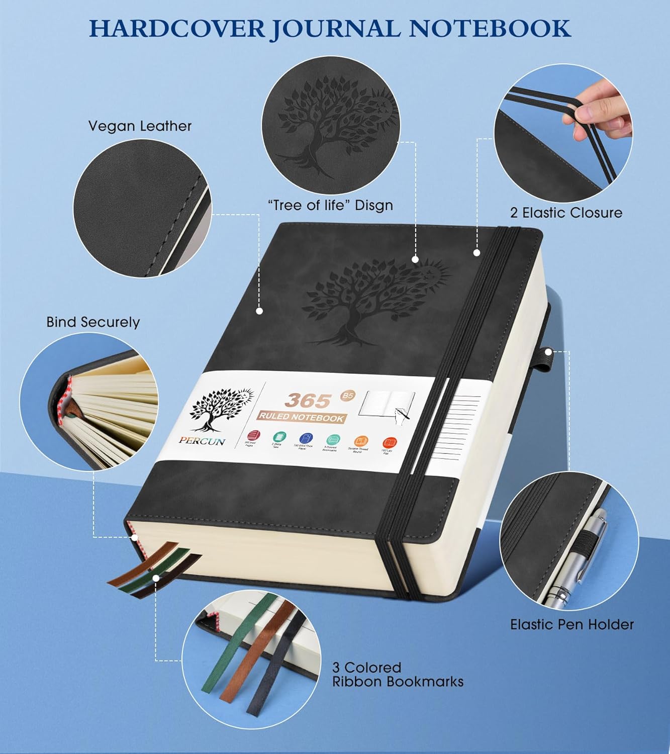 - 【365 Pages Premium Thick Paper】: Our PERCUN lined journal notebook is made of 365 pages high-quality 100Gsm thick ruled pager with an acid-free light Ivory paper that is thicker than normal. This premium quality paper will not cause bleeding, ghosting or smudging and is suitable for most types of pens,provides ample space for journaling, note-taking, and creative writing. The line spacing is 7mm, making it easy to write legibly and neatly.