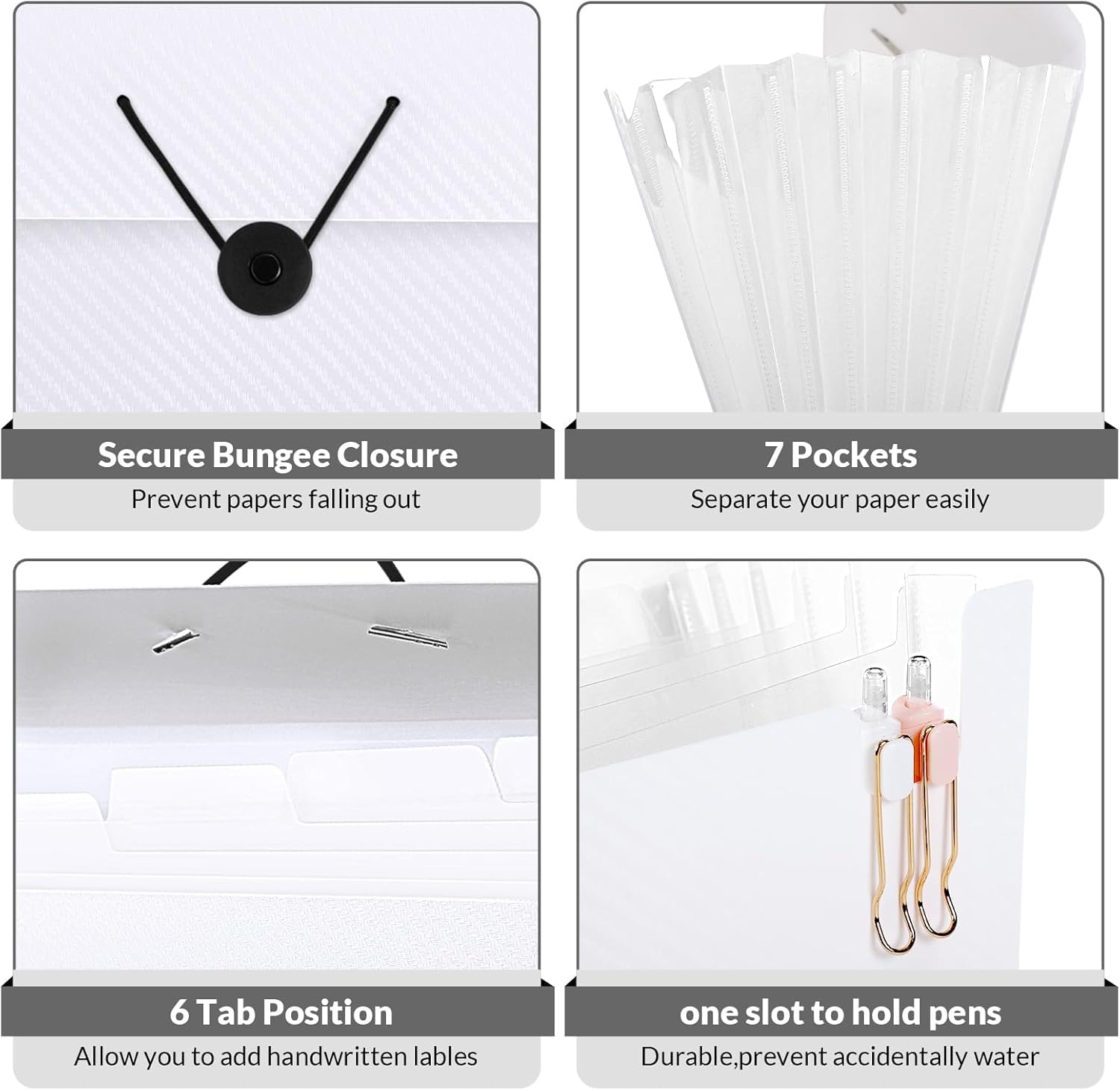 SKYDUE Expanding File Folder with 7 Pockets, Accordion File Organizer, Portable Folders for Documents, School Office Supplies Bungee Closure, Letter/A4 Size White