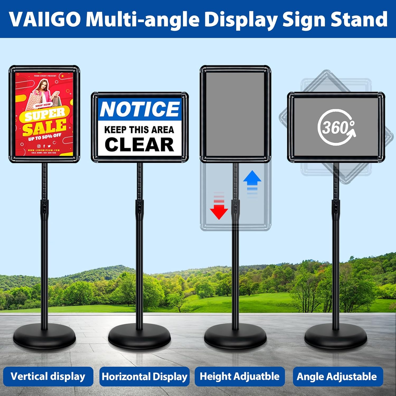 - ✔Height and Angle Adjustable: VAIIGO 8.5x11 sign holder stand height can be adjusted from 32" to 51". Meanwhile the angle of the poster frame can be rotated 360° or 180° to meet your different angles of display needs.