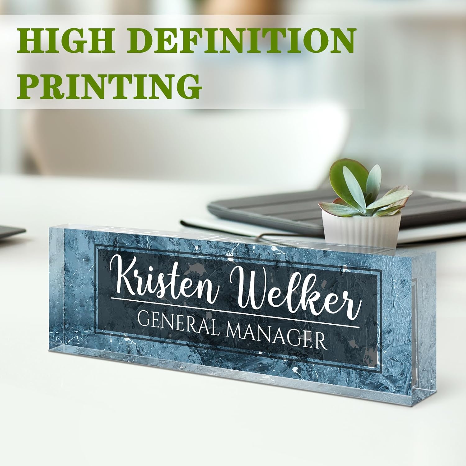 - 🎁【Distinctive Office Decor】In recent years, countless custom-made name plate customers have received envious eyes and praise from colleagues. For traditional boring nameplates, we continue to innovate and update printing/laser technology, only for the exquisite carving of each design Finely cut acrylic glass art ornaments sparkle on your desk and attract everyone's attention