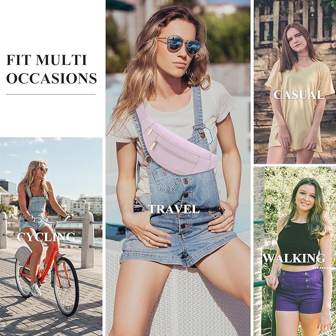 - ▶ Changeable Style Fanny Pack for Women,Many Ways to Wear — Since the comfortable long strap is widely adjustable for most waist size(20” - 50”).There are many ways to wear this fanny pack - (1)As a Waist Belt Bag:Wear it in front of your waist (2)As a Hip Pack:Back on your hip (3)As a Shoulder Fanny Pack or a Sling Fanny Pack:Slant across your chest or over You shoulder.Perfect for various occasions.
