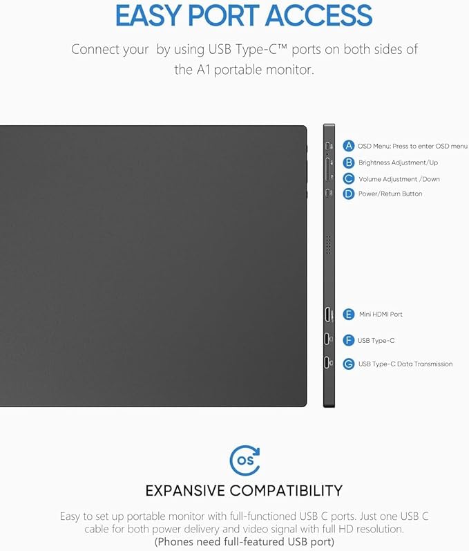 - Wide Compatibility: Enjoy hassle-free plug-and-play functionality with the portable monitor. It is compatible with various ports and devices, including laptops, PCs, Macs, phones, Xbox, PS3, PS4, PS5, and Switches. No app or driver installation required