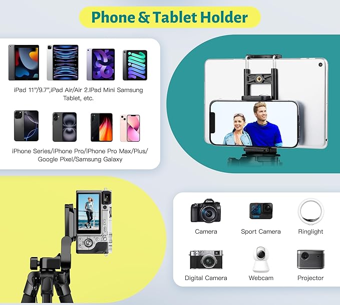 - 【Wide Compatibility】 Tripod stand with a 2-in-1 universal holder compatible with iPhone17 16 15 14 13 12 11 Pro/XS/XR, Samsung Galaxy, IPad Pro 9.7"/10.5"/ 11.9", iPad Mini. And 1/4 screw can set up Nikon, Canon, other digital cameras, projectors, spotting scopes, ring lights. Phone tripod is suitable for recording videos, live streaming, YouTube, video conferencing, and online meetings, vlogging, selfies, group photos, family photos...(NOTE: The tripod comes with a tablet holder and is only suitable for tablet devices within 11 inches.)