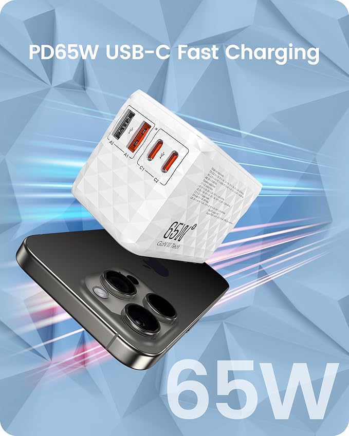 - 65W USB-C Fast Charging: This 65W travel adapter fast charges phones, tablets, and USB-C notebooks, with the USB-C port delivering up to 65W. It fully charges a MacBook Air M2 in under 2 hours and an iPhone 14 Pro to 78% in 30 minutes. Smart charging technology ensures optimized power output for extended battery health and a superior charging experience