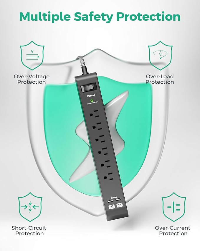 - 【Surge Protector for All】 - 6 outlets surge protector power strip with 900-joule surge-protection rating provides 3-line comprehensive surge-protection for computer, TV and other household, office electrical appliances from voltage fluctuations, surges and spikes.