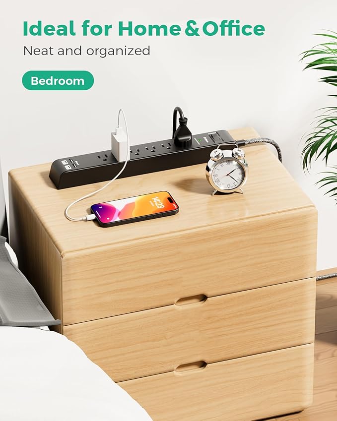 - 【Electric Strip with Overload Protection】 - Slim, sleek and compact design reduces office clutter; Lighted power switch with an 15-Amp circuit breaker to signify your devices are protected from power surge, over-heated, overload, over-charging,Fire-prevention ( 1382℉. )