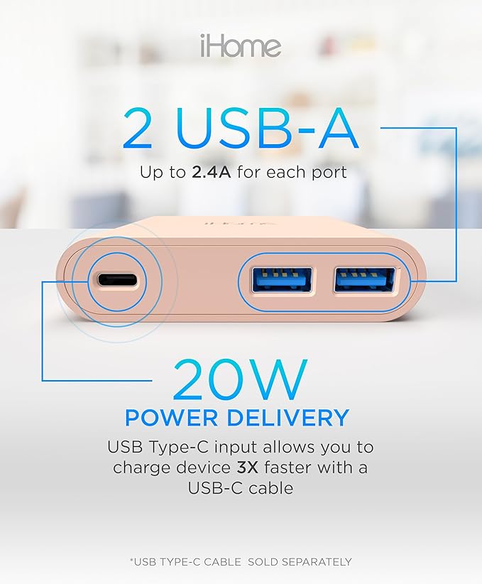 iHome 32W AC Pro Multi Port USB Wall Charger Block - Charging Station for Multiple Devices with 3 Ports (1 USB-C, 2 USB-A) - Fast Charging, Universal Compatibility (Pastel Pink)