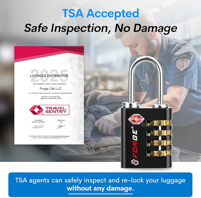 - TSA Approved Luggage Locks: Forge TSA approved locks are recognized by the TSA, with two TSA logos on the front and back of the lock, making them hassle-free for airport security inspections. Forge travel locks can be used on a wide variety of items besides suitcases or luggage. These locks can be used on a toolbox, pelican case, briefcase, gym locker, purse, backpack or laptop bag.