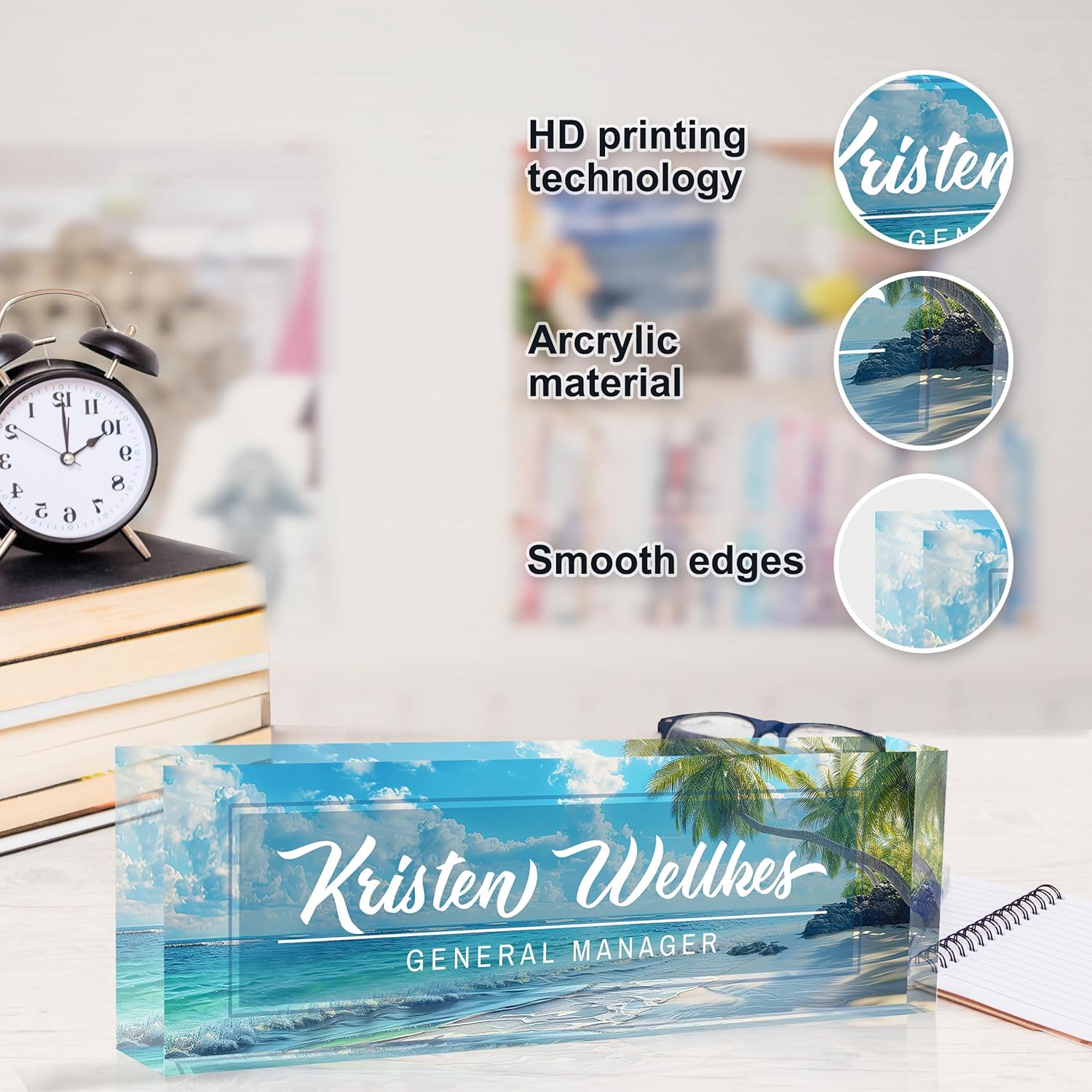 - High Quality Products: This high quality custom desk name plate is made of eco-friendly acrylic material, using the most professional cutting technology, the most advanced HD printing technology and the latest adhesives, which makes the product look beautiful, strong and durable, and the problem of peeling off of the pattern never exists, so please rest assured to buy our name plate for office desk.