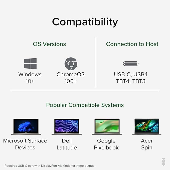 - Compatible Devices : Supports full-featured USB-C, USB4, and Thunderbolt 3 / Thunderbolt 4 systems running Windows 10 / 11 & ChromeOS 100 or newer including, HP ProBook / EliteBook / Spectre x360 series, Dell XPS / Latitude / Inspiron series, Lenovo ThinkPad / IdeaPad / Yoga, Microsoft Surface Pro / Go / Book / Laptop models, LG Gram, Thousands of other laptops which are compliant with full-featured, standards-compliant USB-C ports Supports full-featured USB-C, USB4, and Thunderbolt 3 / Thunderbolt 4 systems running Windows 10 / 11 & ChromeOS 100 or newer including, HP ProBook / EliteBook / Spectre x360 series, Dell XPS / Latitude / Inspiron seri⦠See more