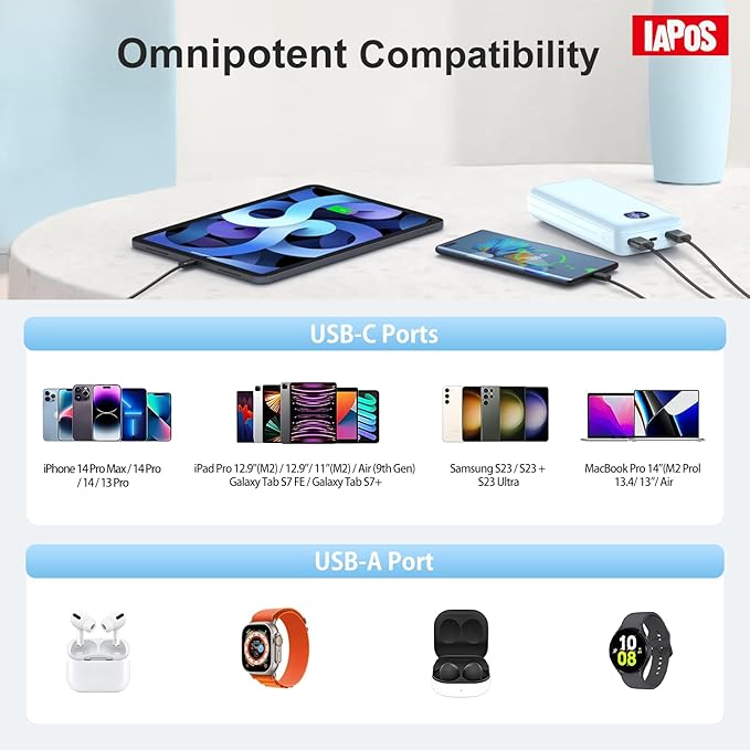 - [Triple-Port & Omnipotent Compatibility]: IAPOS battery pack portable charger comes with 2 USB-A (22.5W output) ports and 1 USB-C (18W input/22W output) port, allowing for simultaneous charging of up to three devices. IAPOS portable battery charger widely compatible with iPhone 15/15 Plus/15 Pro/15 Pro Max/iPhone14/13/12/11/Samsung Galaxy/Google Pixel and more Android phones/tablet and other electronic devices.