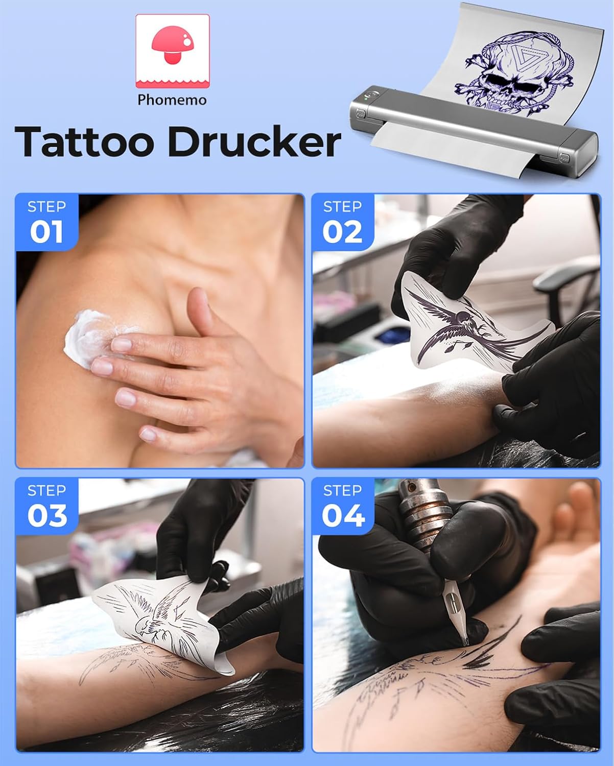 - Powerful Phomemo App - Say goodbye to complicated printing processes - our Phomemo App allows for one-click printing of images and documents. Unlike traditional tattoo printer machine that require printing on white paper before copying, you can print your designs instantly with our app. Plus, for optimal printing results, we recommend using Phomemo Tattoo Transfer Paper.Alternatively, connect to your PC/Laptop via USB cable and print directly. (PC/Laptop printing download the driver: m08f.phomemo.com)