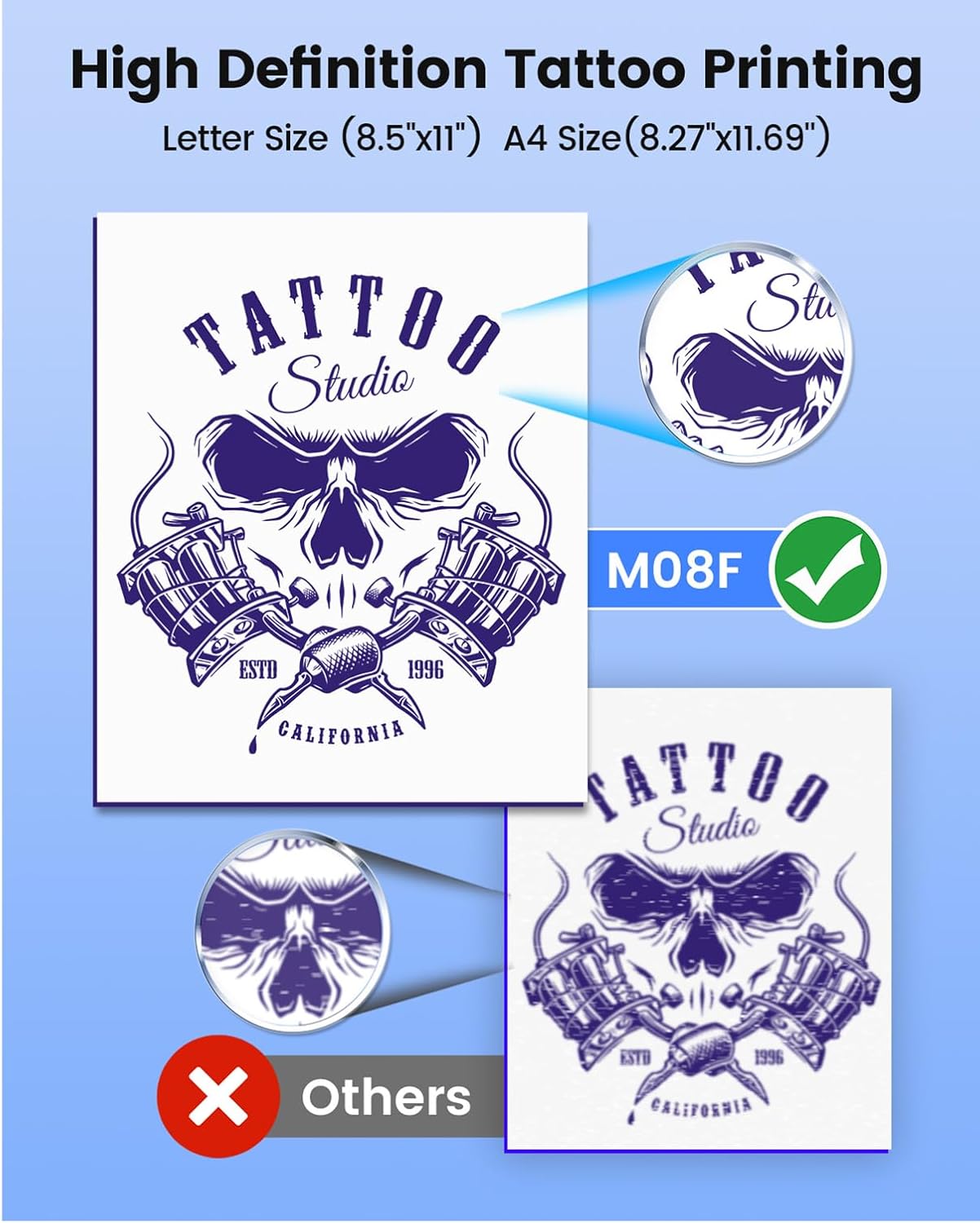 - Exceptional Print Quality: Phomemo bluetooth tattoo stencil printer delivers crisp, dark, and sharp images with smooth printing effects. Experience hassle-free printing with high-quality black and white results every time. Phomemo tattoo stencil printer Compatible with 8.5''x11'' transfer tattoo paper
