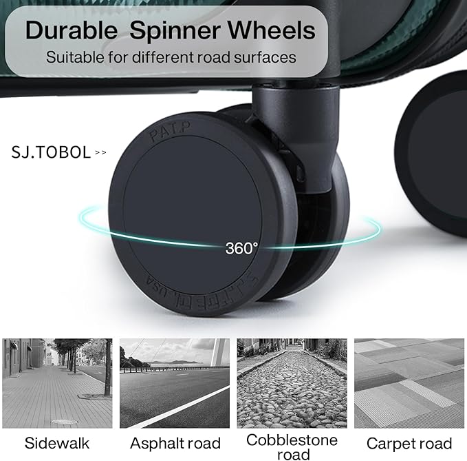 - 【High Quality Accessories】SJ . TOBOL durable spinner wheels,It is composed of precision shaft center and thickened TPE wheel skin, which is very wear-resistant,quieter and has strong bearing capacity, It is applicable to different roads such as cobblestone road and carpet road. Smooth and durable 5-strand reinforced explosion-proof zipper reverse coil prevents burst zipper. Travel-approved combination lock is safe and convenient. Ergonomics telescopic handle with multi-steps adjustment.