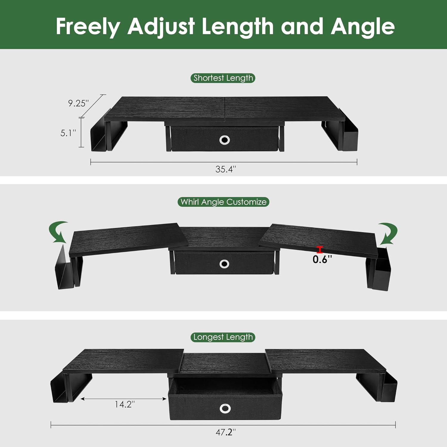 - Adjustable Angle & Length:The length of monitor stand riser with drawer can be adjusted from 35.4 to 47.2 inches, and angle can be adjusted +/-90 degree to meet various office needs and obtain a better viewing experience. If you need multiple computers to work at the same time, you might as well choose our extra large monitor riser for 2 monitors.