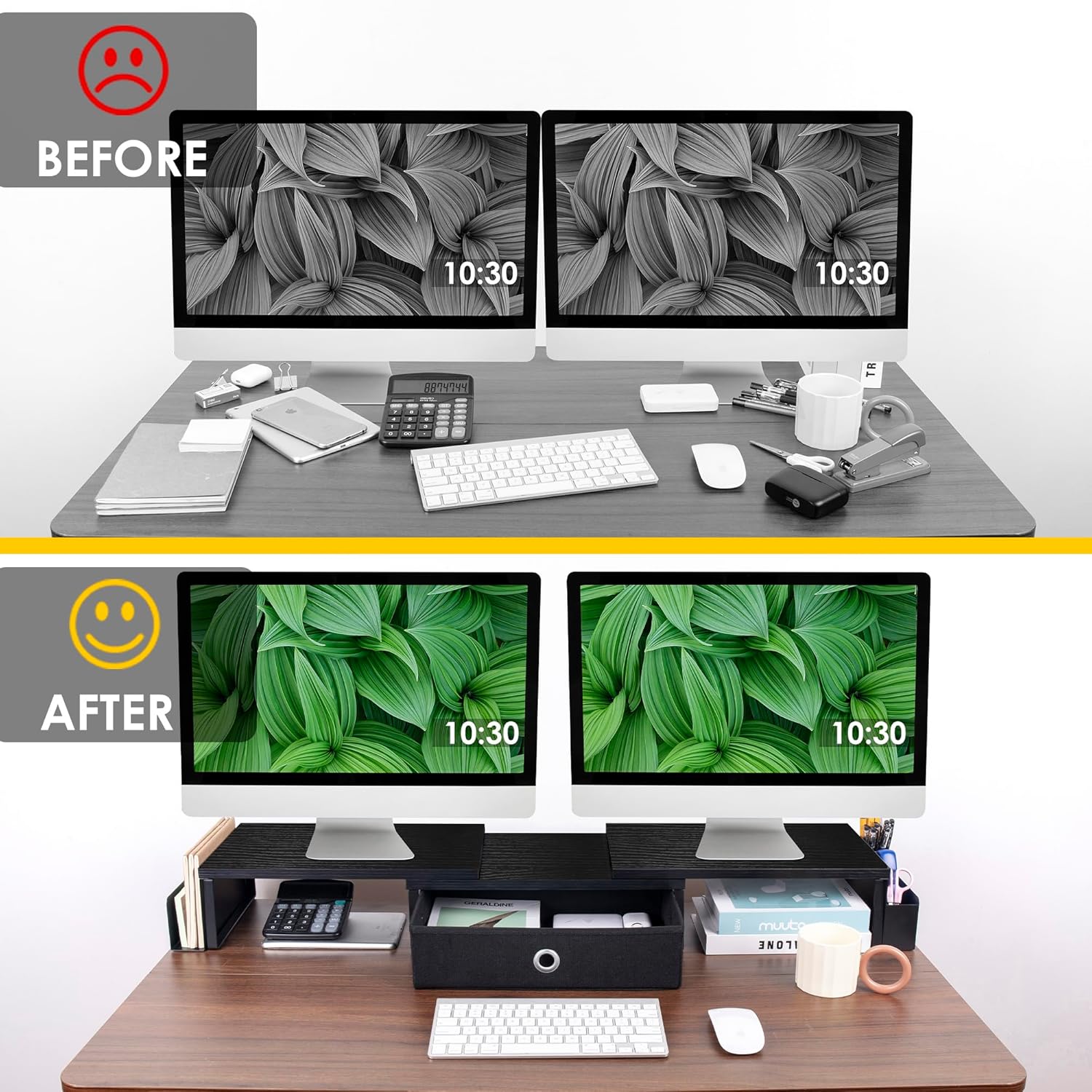 - Large Storage Space:Monitor riser for 2 monitors comes with a sliding drawer and two side caddies,which provide more storage space for your desk.The drawer could store personal items in privacy. One side caddies has divider that could store small office items, and the other side caddies is large enough to store file. Dual monitor stand with storage used as desk organizer to offer more comfortable office environment.