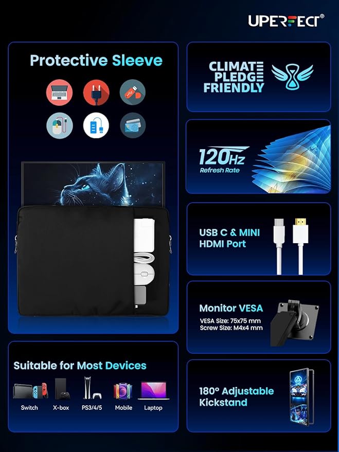 - VESA & KICKSTAND: UPERFECT travel monitor features the slimmest 18.5 inches USB C monitor and 0.2 inches slim; The VESA and patented 180° adjustable kickstand integrated design make this portable laptop monitor convenient to become the ideal travel companion for laptops and phones as second screen to improve work efficiency and simplicity; This monitor doesn’t come with a protective case, if you need one, please let us know