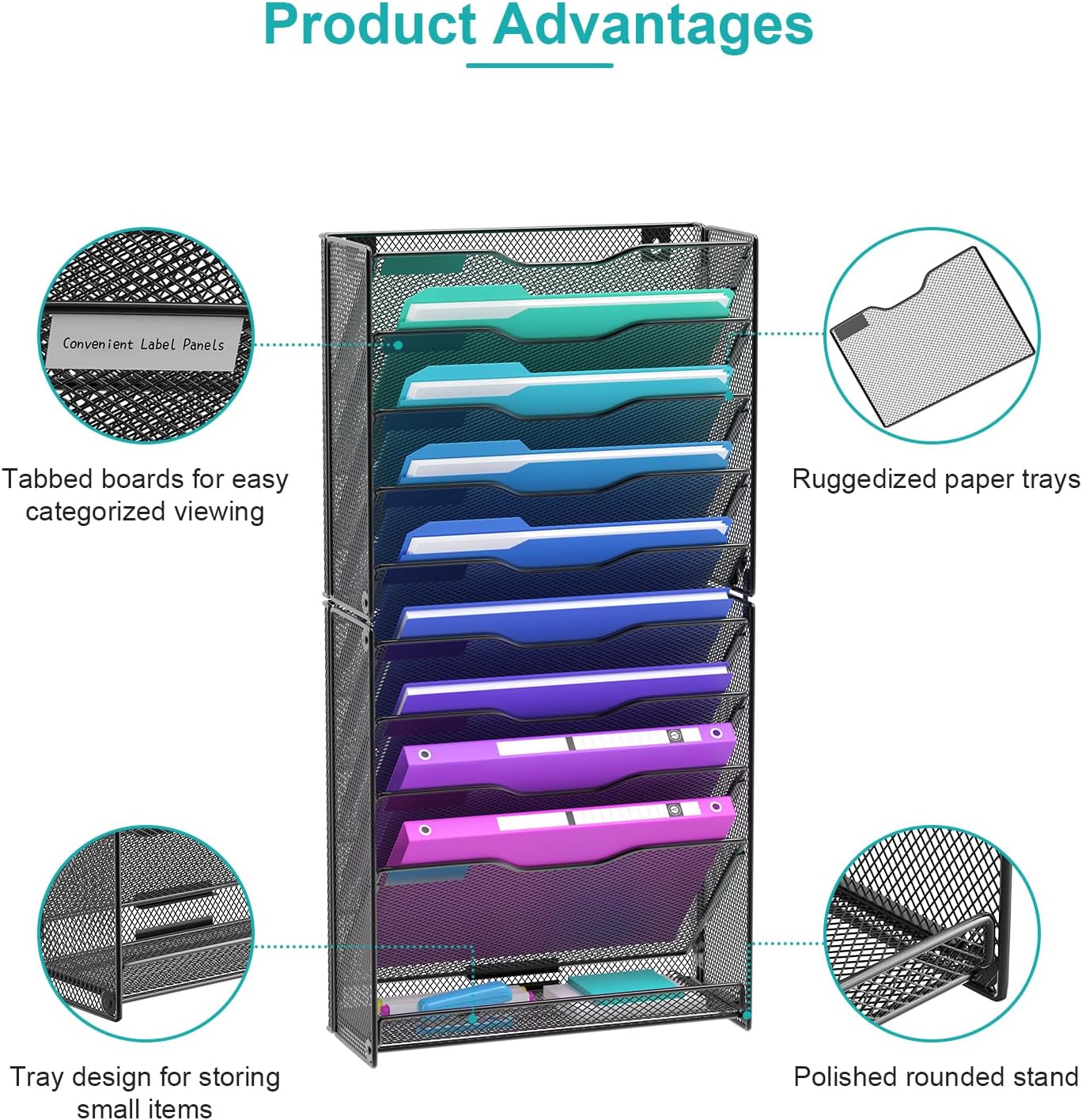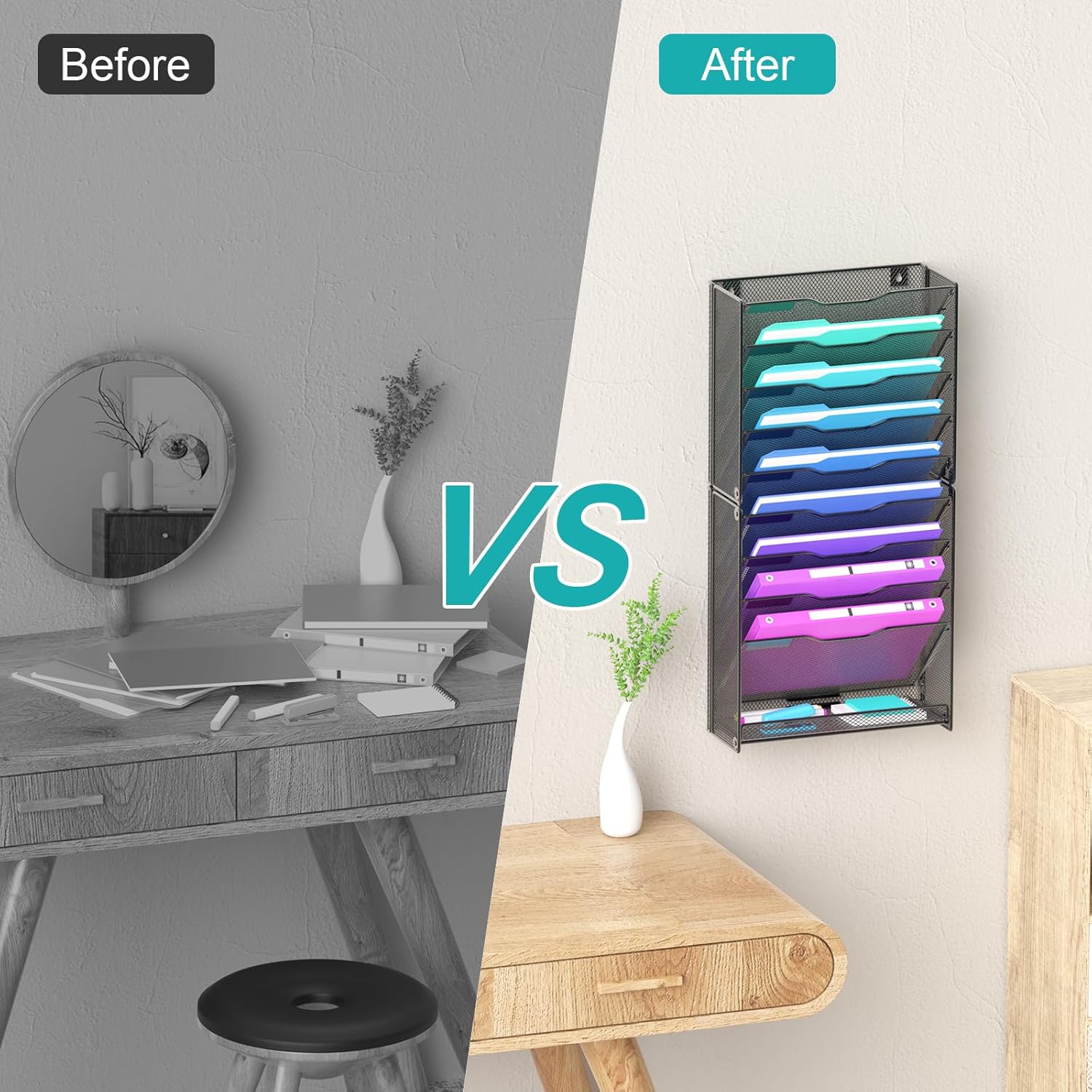 - VERTICAL STORAGE SPACE: 10-layer wall organizer can make full use of the vertical storage space, make the desktop more clean and tidy, categorize and organize diversified items, improve office efficiency.