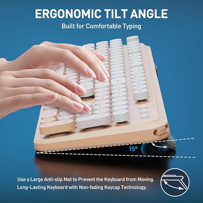 - ☕Fashion & Quiet Mouse Design Desk Accessories Keyboard - Stylish retro keyboard and mouse wireless with colorful round 104keys and glossy smooth edges to brighten your workspace. Featuring low-profile whisper-quet technology, this sleek combo ensures a distraction-free typing experience. Perfect for modern desks seeking cute wireless keyboard and mouse aesthetics.