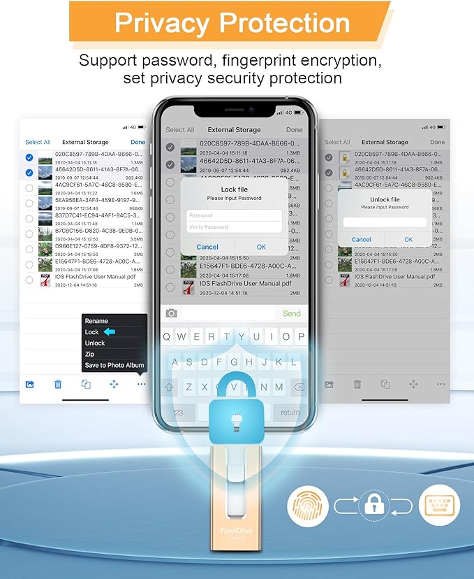 - 【Securing Personal Files】: The phone photo transfer stick provides a separate password function to encrypt the file information in the app. You can set a password to effectively protect your private files and protect the whole storage or selected parts. In this way, you can use the phone thumb drive with confidence and enjoy a more comfortable and secure file storage experience.