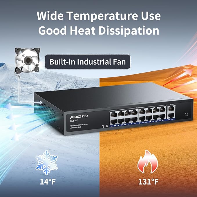 - 【18 Gigabit Port】AUMOX PRO ethernet switch includes 16* 10/100/1000Mbps RJ45 PoE ports with 2 Uplink gigabit ports. Excellent data transmission performance